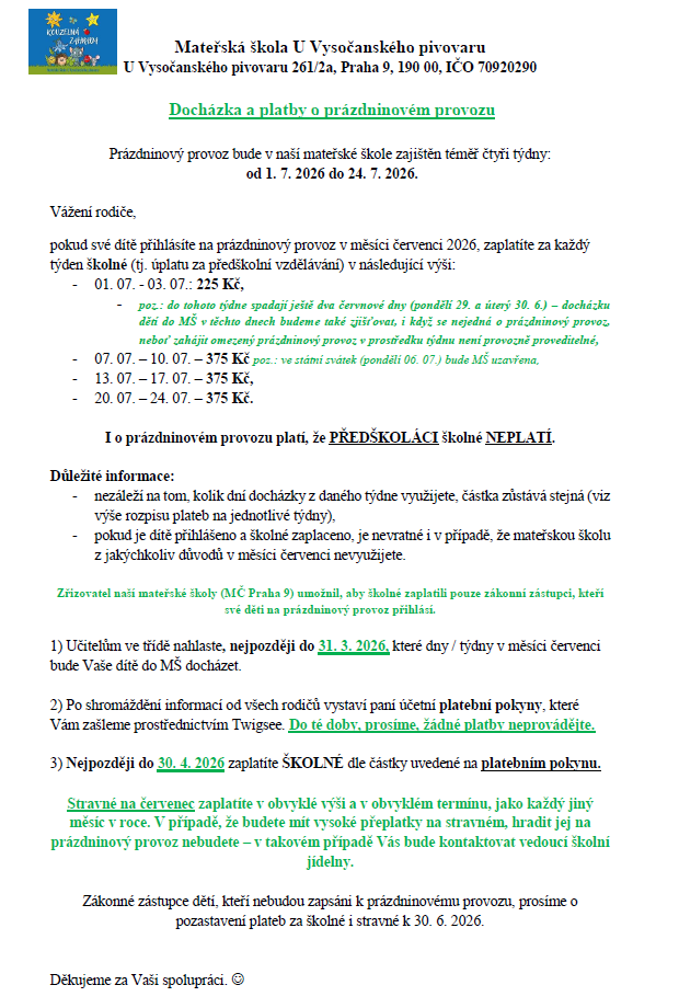 | Červen Červenec Srpen | 29. 6. – 24. 7. 2026 27. 7. – 31. 8. 2026 | Hlavní prázdniny (MŠ v omezeném provozu) Informace ZDE. Hlavní prázdniny (MŠ uzavřena) |